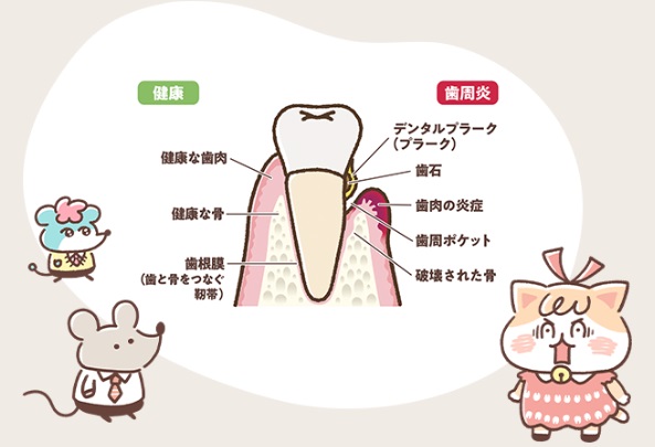 歯周病は、プラーク中の歯周病原細菌によって引き起こされる感染性炎症性疾患で、歯の周りの歯ぐき(歯肉)に炎症が起こり、さらに進行すると歯を支えている骨が溶けてしまう病気です。
